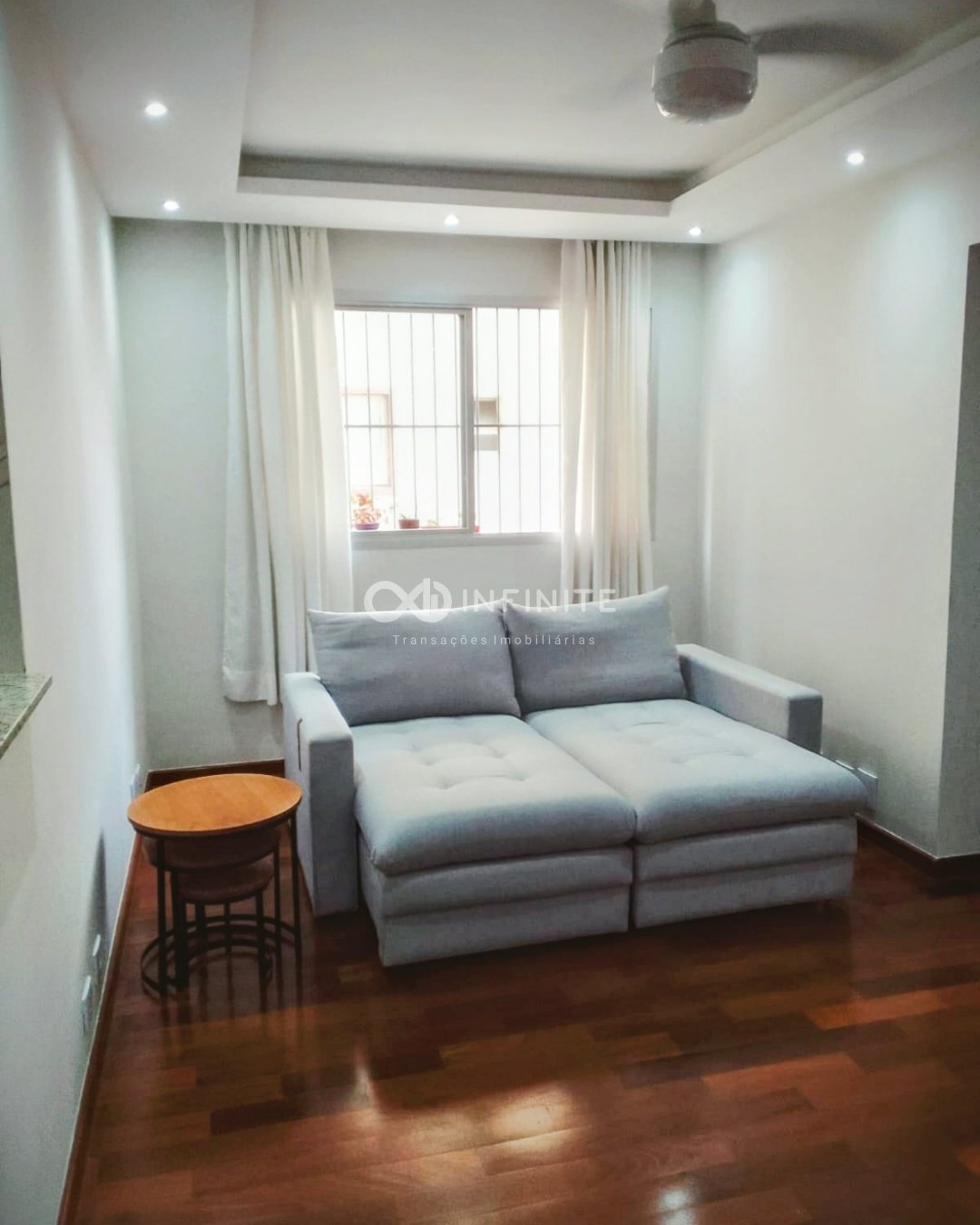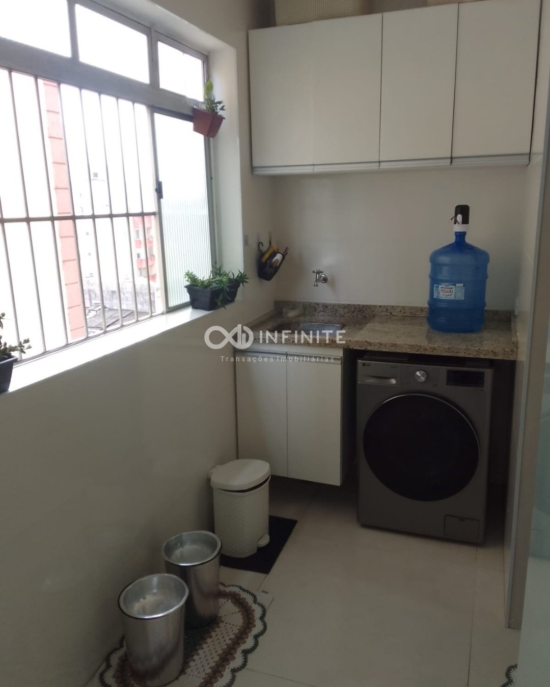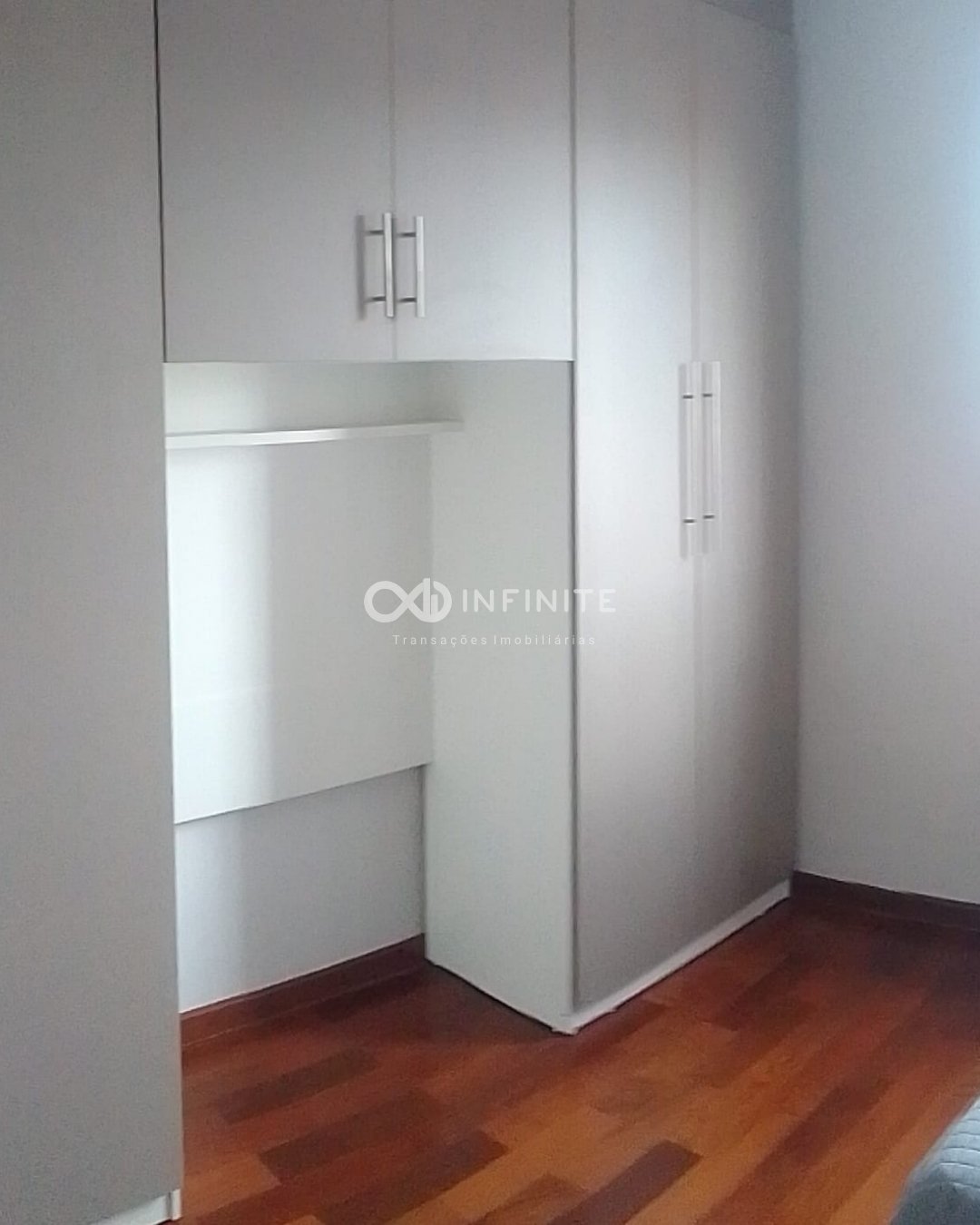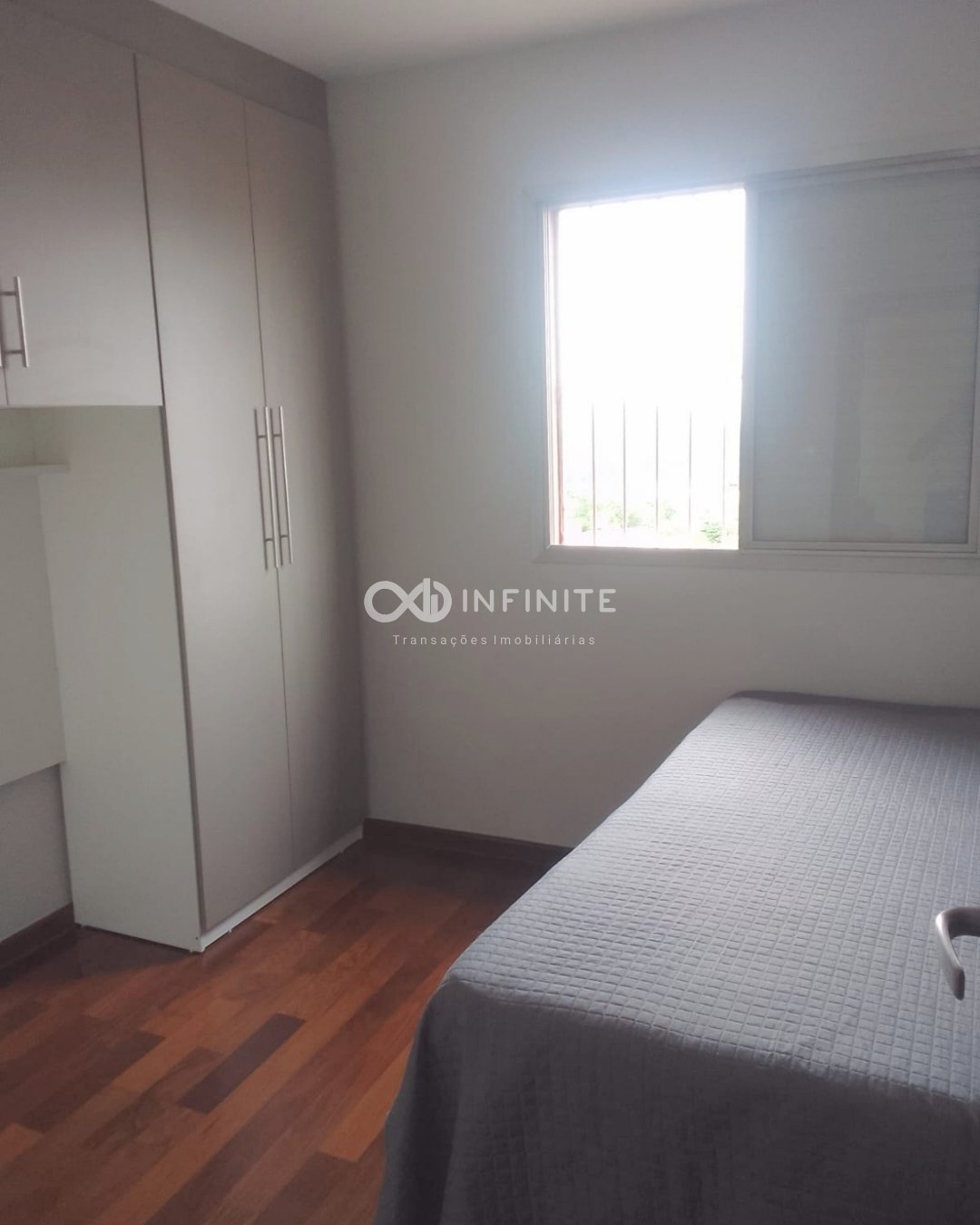 Entre os diferenciais estão o piso laminado de madeira nas áreas secas e cerâmico nas áreas molhadas, armários planejados na cozinha, quartos e banheiros, além de banheiro com box em vidro e janelas com grade de proteção.